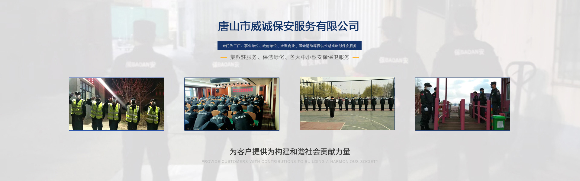 唐山市威誠保安服務有限公司自成立以來以“嚴防死守、忠于業(yè)主”為服務原則,以“客戶滿意、 合作共贏”為根本目標。以科學的管理、多方位多層次的服務,建立了首問責任制,完善了走訪、回訪 、滿意度調(diào)查、末位淘汰的預警管理,不斷提高服務質(zhì)量,提高業(yè)主滿意度,提高企業(yè)形象。秉承“誠 實守信,紀律嚴明,團結(jié)協(xié)作,致精致誠”的服務理念,為客戶提供高品質(zhì)、多方位、專業(yè)化的保安服務。 本公司制定了嚴謹?shù)亩ㄏ蛘猩?、崗前培訓、考核錄用、崗中培訓、持續(xù)培訓、末位淘汰制等一整套完善的管理體系。可以根據(jù)客戶的要求實地勘察評估,以量身定做的方式提供安保防范服務。